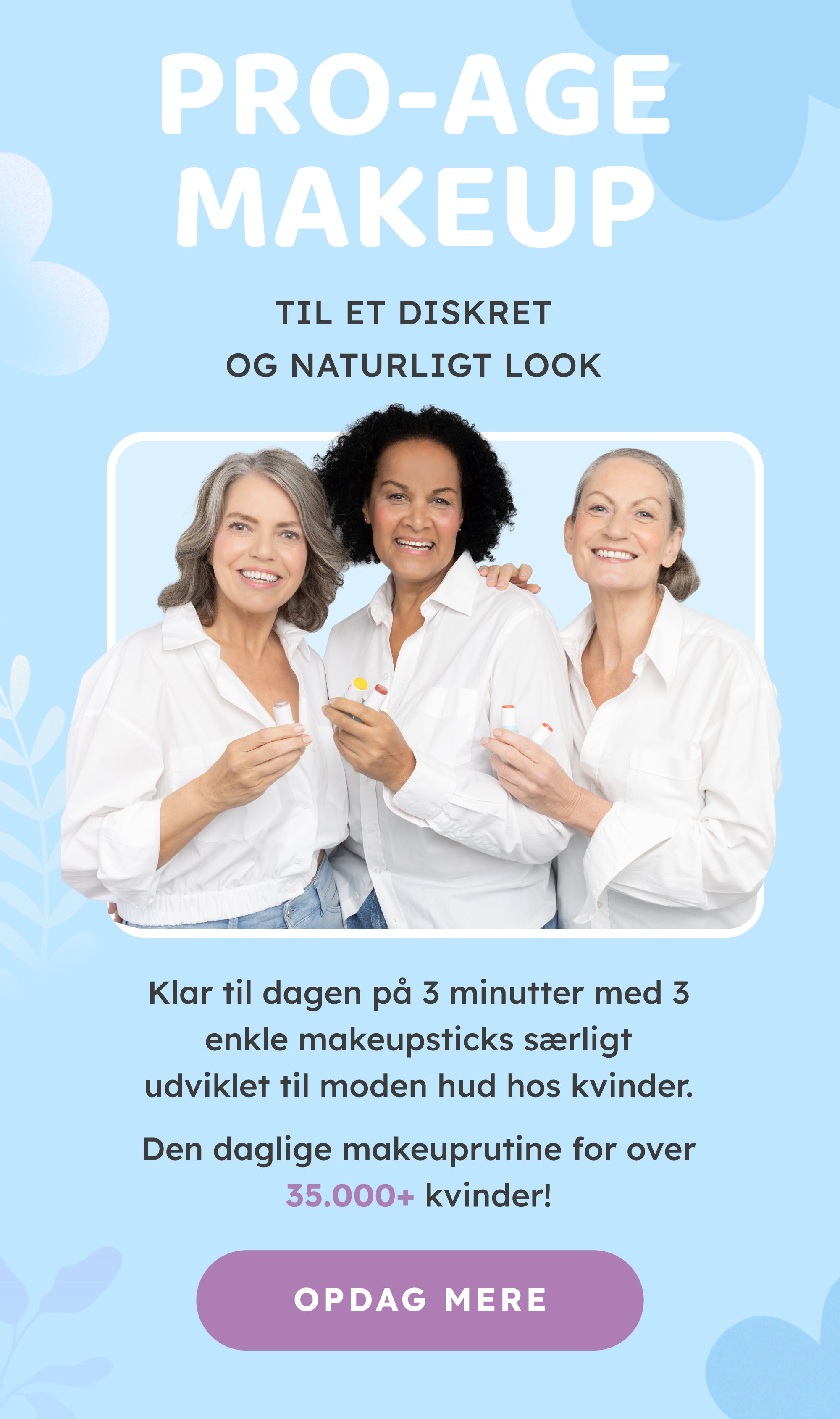Vores mission er at give kvinder over 45 mere selvtillid ved at få dig til at stråle naturligt på bare 3 minutter. Det gør vi med multifunktionelle makeupprodukter, der er baseret på en cremeformel.