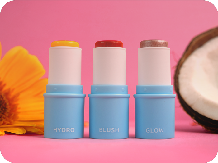 Hydro Stiften giver straks din hud et boost af fugt og en sund glød. Blush Stiften tilpasser sig automatisk din hudtone og giver en frisk, naturlig farve. Og med Highlighteren kan du lade lyset ramme de helt rigtige steder for en blød glød.
